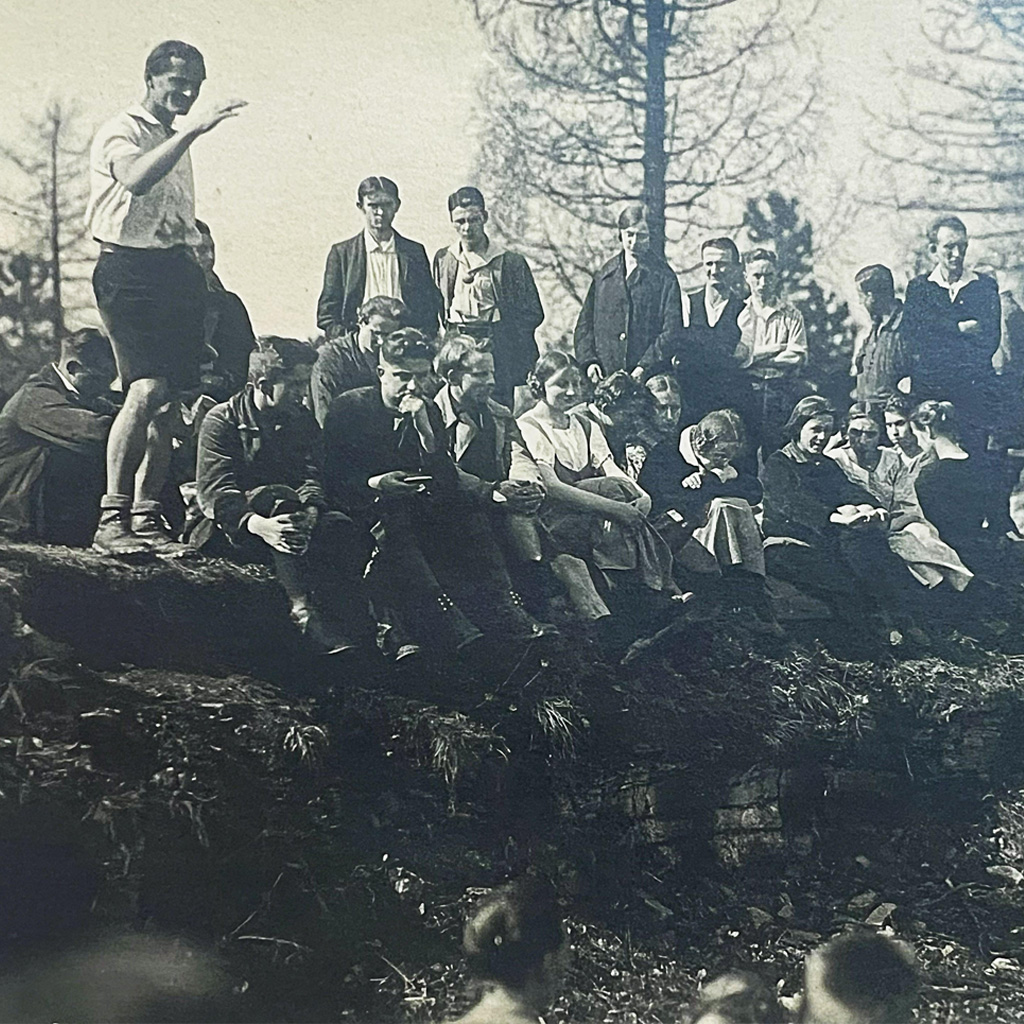 Der junge Werner Zimmermann hält einen Vortrag inmitten der Natur.